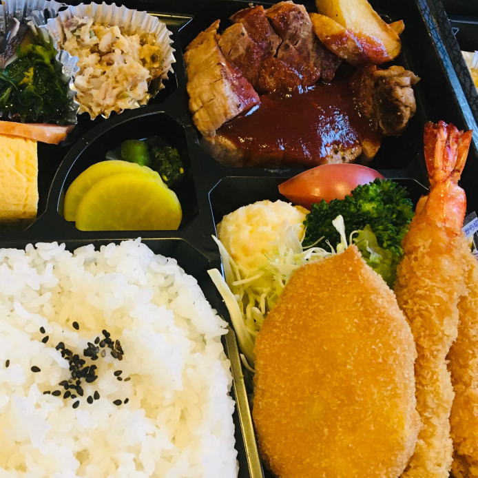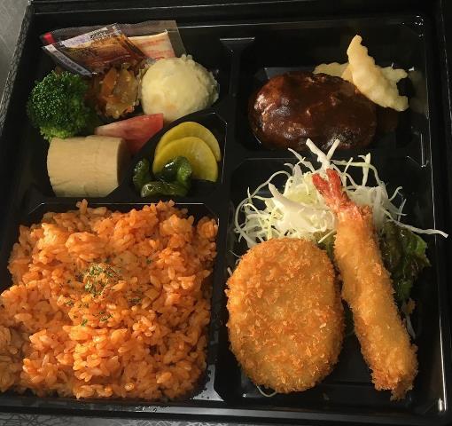 | 【メインと揚げ物が選べるお弁当】 [注文例] 会議用弁当のヒレステーキ、エビフライを10個。 |
