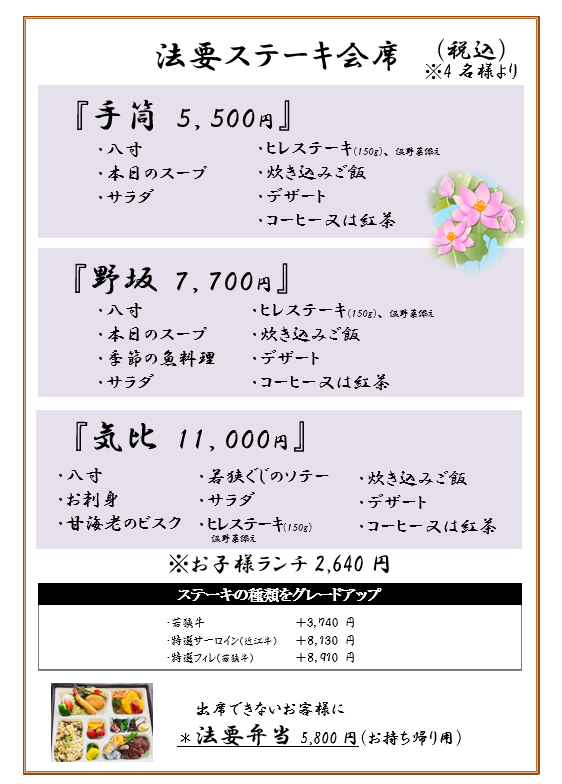 福井県敦賀市の法要、法事、お葬式の仕上げは是非ステーキ&ワインぼたん亭の「法要会席」を