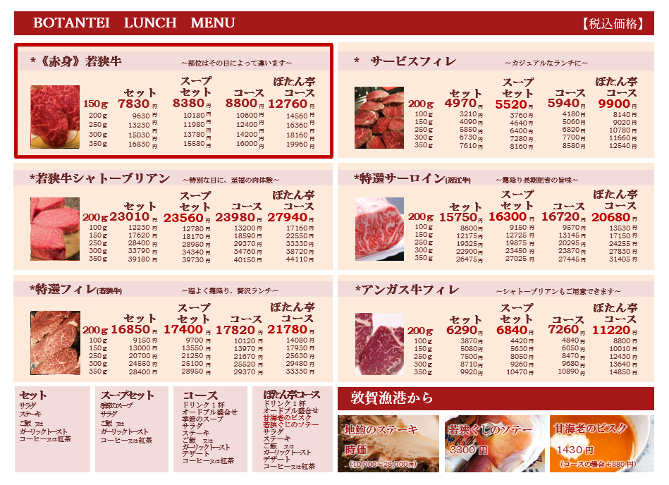 記念日には「若狭牛シャトーブリアン」、「特選フィレ」