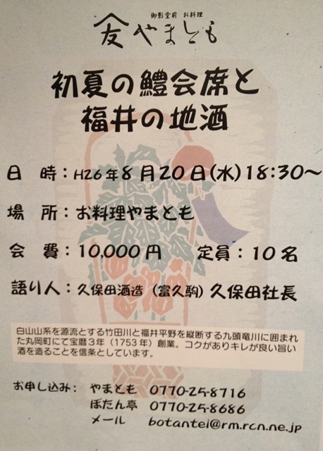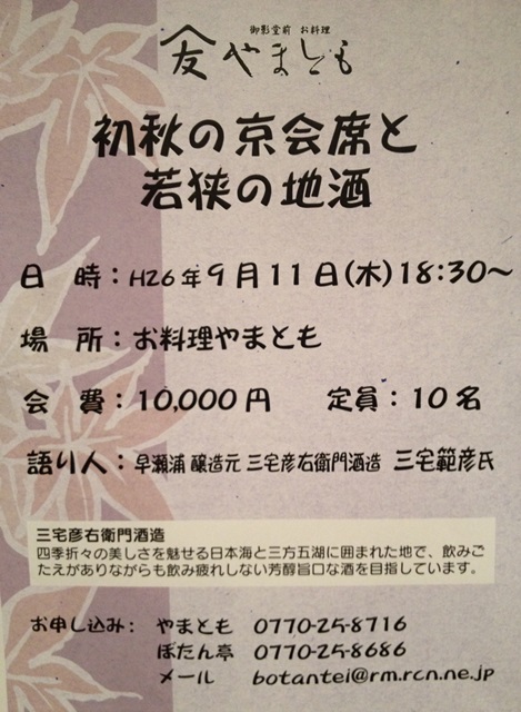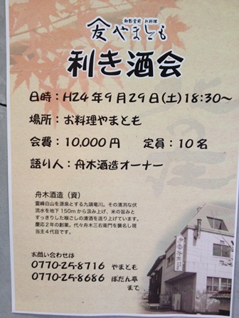 姉妹店のやまともで9月29日に利き酒会を開催します。 今回は「北の庄」の舟木酒造のオーナーに来ていただきます。 参加者募集中。 18:30〜 会費 10,000円です。